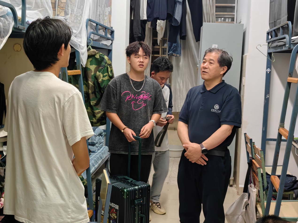 8月19日晚,校长王华带队到学生宿舍走访看望新利18备用官网新生,学院领导、2024级新生班主任和辅导员参加走访。