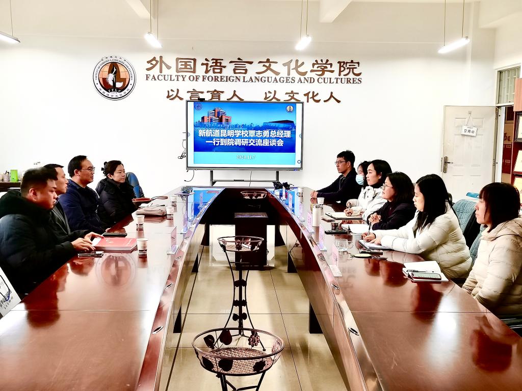 覃志勇对新航道昆明学校的发展历史、企业文化、业务范围、岗位需求等信息进行介绍。王英介绍了学院办学历史、学科专业建设、教师发展以及本科生人才培养等整体情况;孙冠华介绍了学院本科生的就业情况、择业方向等信息;马倩介绍了学院举办英语学科竞赛以及学生参加竞赛的基本情况、学院组织本科生集体实习的开展情况以及未来实习岗位需求等。双方就学生实习岗位、就业岗位、出国(境)留学咨询服务、“用英语讲中国故事”大会举办等内容进行深入交流,并达成了初步的合作意向。