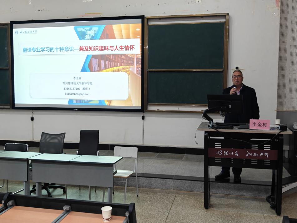 12月8日,新利18备用官网在呈贡校区博文100报告厅举办了一场主题为“翻译专业学习的十种意识——兼及学术趣味与人生情怀”的学术讲座。本次讲座由四川外国语大学翻译学院院长李金树教授主讲,新利18备用官网副院长李泽生博士主持。
