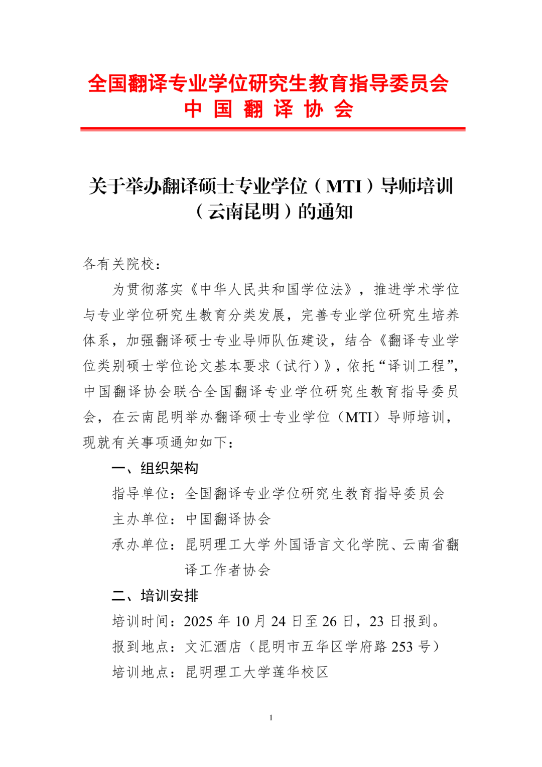 关于举办翻译硕士专业学位(MTI)导师培训(云南昆明)的通知