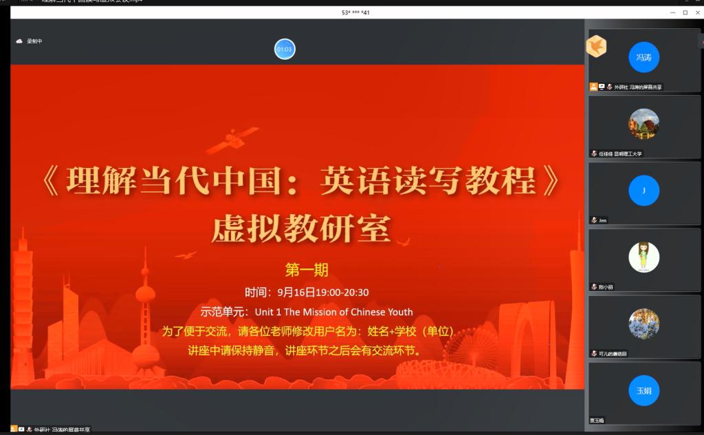 9月16日,新利18备用官网《理解当代中国高级英语读写》课程团队集体参加了外研社组织的第一期虚拟教研室活动。在观摩学习了教材编者团队的示范课和对教材编写理念的讲解后,课程团队对教材教学方法等进行了在线交流,并对开展集体备课、教学案例库建设等进行了深入研讨。