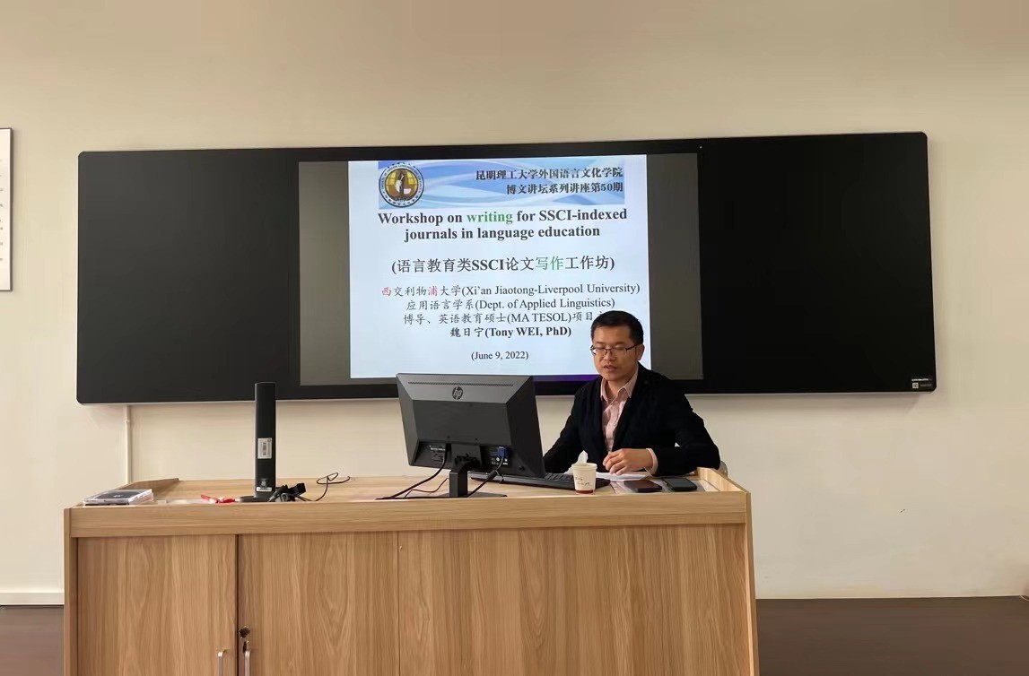 6月9日上午西交利物浦大学应用语言学系博士生导师、副系主任、英语教育硕士项目主任魏日宁博士为外文学院师生做题为《语言教育类SSCI论文写作工作坊》的学术讲座。讲座由邓东元教授主持,外文学院教师和研究生四十余人聆听了讲座。