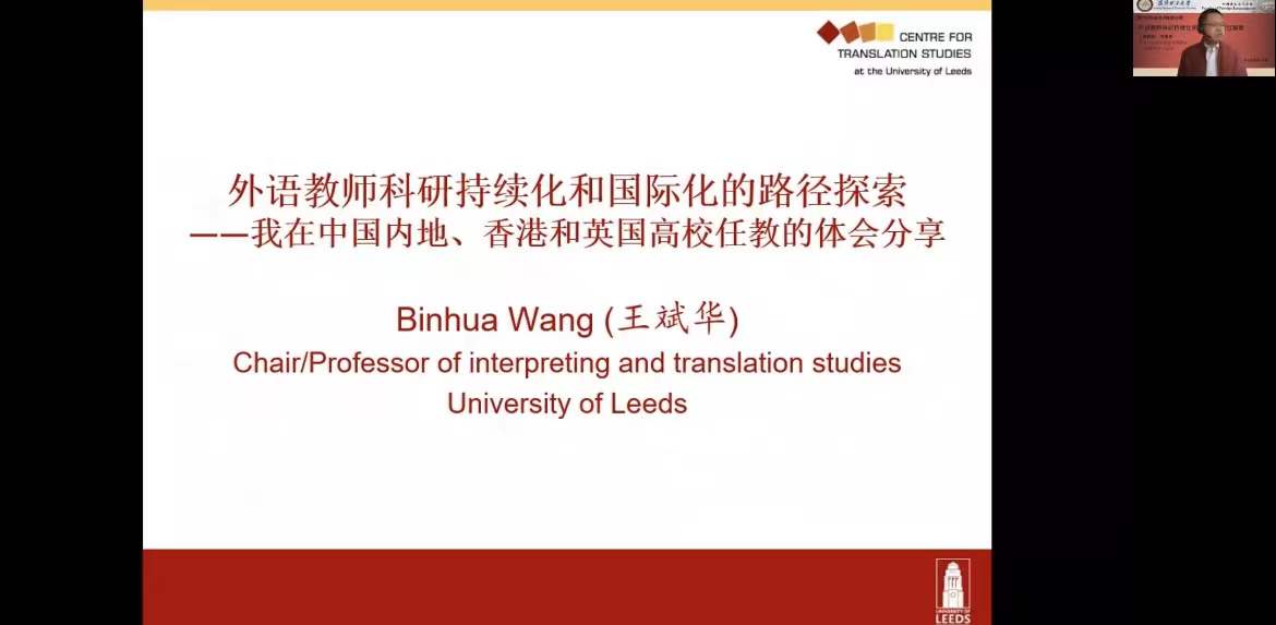 5月19日下午,英国利兹大学终身讲席教授、翻译学中心主任王斌华教授应邀为我校师生做了一场题为 “外语教师科研持续化和国际化的路径探索”的线上学术讲座。新利18备用官网教师、翻译硕士研究生和英语类专业本科生以及来自全省其他高校的百余名师生参加了讲座。