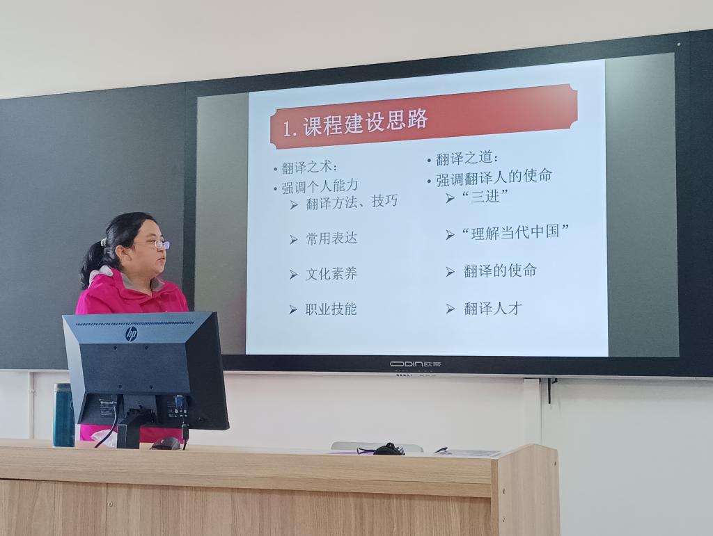 英语系主任任佳佳老师介绍了《理解当代中国》英语系列课程建设的整体情况,通过组建教学团队、理论学习和参加教育部的虚拟教研室交流活动,英语系教师积极探索将立德树人的目标贯穿到英语类专业教育每一个环节的创新路径。《理解当代中国》汉英翻译主讲教师毕凌成、演讲团队负责人李筠、高级英语读写主讲教师高维分别从课程目标、大纲编写、核心概念理解、语料库建设、MOOC资源建设和考核方式等实施要点进行案例分析,展示了课程思政的教学成果和教学设计理念。通过研讨,英语系全体教师认为英语类专业课程既蕴含着丰富的人类文化基因和价值范式,又因语言工具价值与人文价值并存的特点,在实践理想信念教育,传承中华文明这一教育精神方面大有可为。