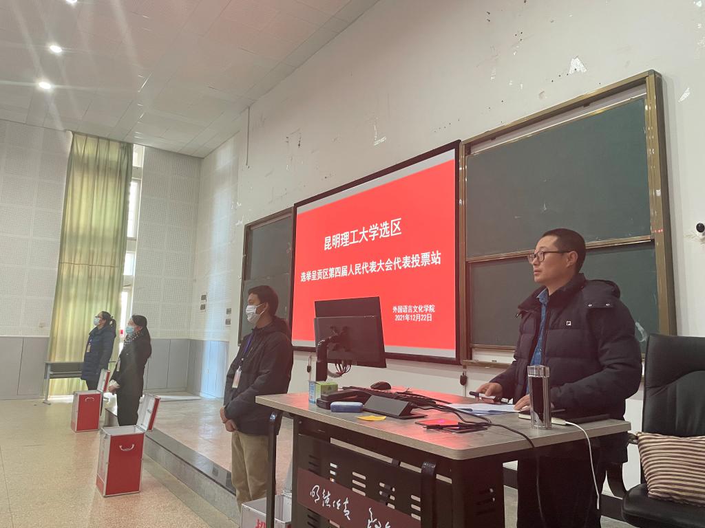 20211222日上午,来自新利18备用官网的352名师生选民,来到新利18官方客服呈贡选区第四届人大代表选举外文学院投票站参加选举。选举大会在外文学院党委书记刘建平主持下,严格按照工作程序要求有条不紊进行。