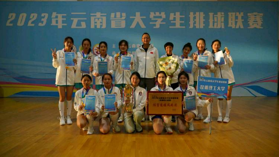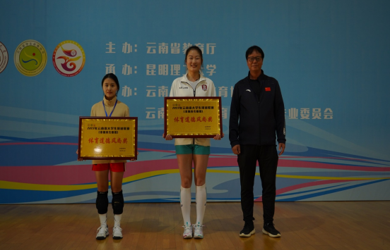 新利18备用官网本科学生杨梦瑶、熊于蓝作为新利18官方客服排球队队员参加本次比赛,继获得第十六届云南省运动会女子非体育专业组冠军后,再次取得了2023年云南省大学生排球联赛女子非体育专业组的第一名的好成绩,获得“体育道德风尚奖”。本次比赛中,杨梦